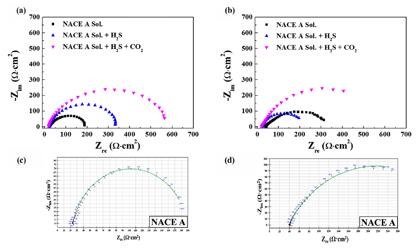 표 2에 제시된 용액조건 내에서 전기화학적 임피던스 분광분석법(Electrochemical impedance spectroscopy, EIS)이 수행되었으며