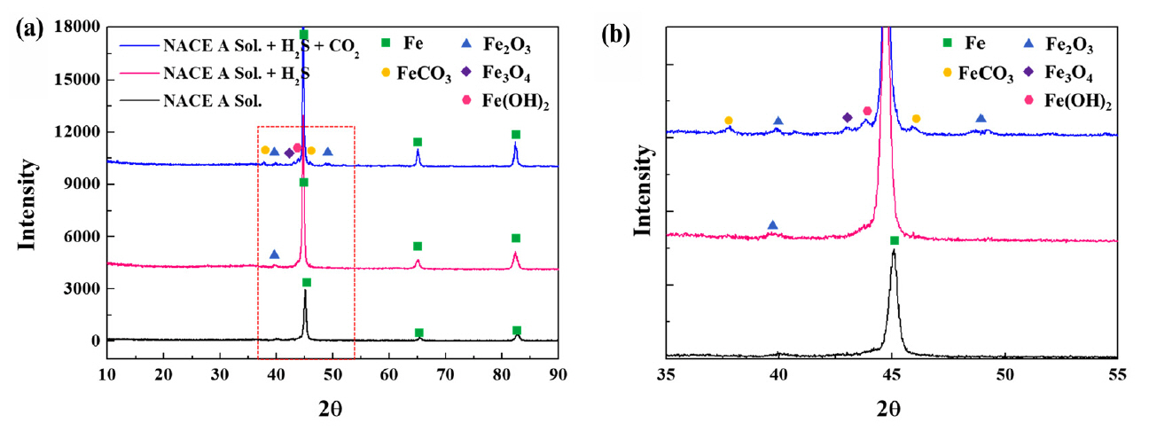 같이, 미량의 H2S 형성을 위한 Na2S 첨가는 용액의 pH를 대략 4-5 수준으로 상승시키며 이 경우 FeS 계열의 부식생성물의 석출을 촉진할 수 있다. 일반적으로 강재를 대상으로 H2S 부식의 초기 표면생성물은 FeS1-X 계열의 준안정적 mackinawite로 알려져 있다 [34]. Ma [35]의 선행연구에 따르면 H2S의 분압 및 침지시간 증가에 따라 황 결핍도가 감소하며 결국 FeS 및 FeS2의 형태로 변이되며 구조 자체의 치밀도가 증가하고 전도성은 반대로
