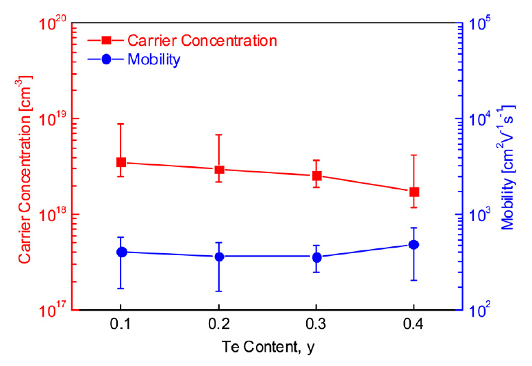 The carrier (hole) concentration decreased from 3.56 × 1018 to 1.74 × 1018 cm-3 as Te content increased. Mobility is generally inversely related to carrier concentration