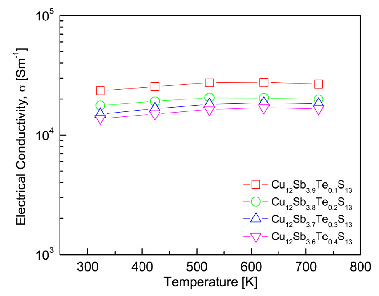 Figure 4 shows the electrical conductivity of the Cu12Sb4-yTeyS13. The electrical conductivity was relatively constant at temperatures from 323 to