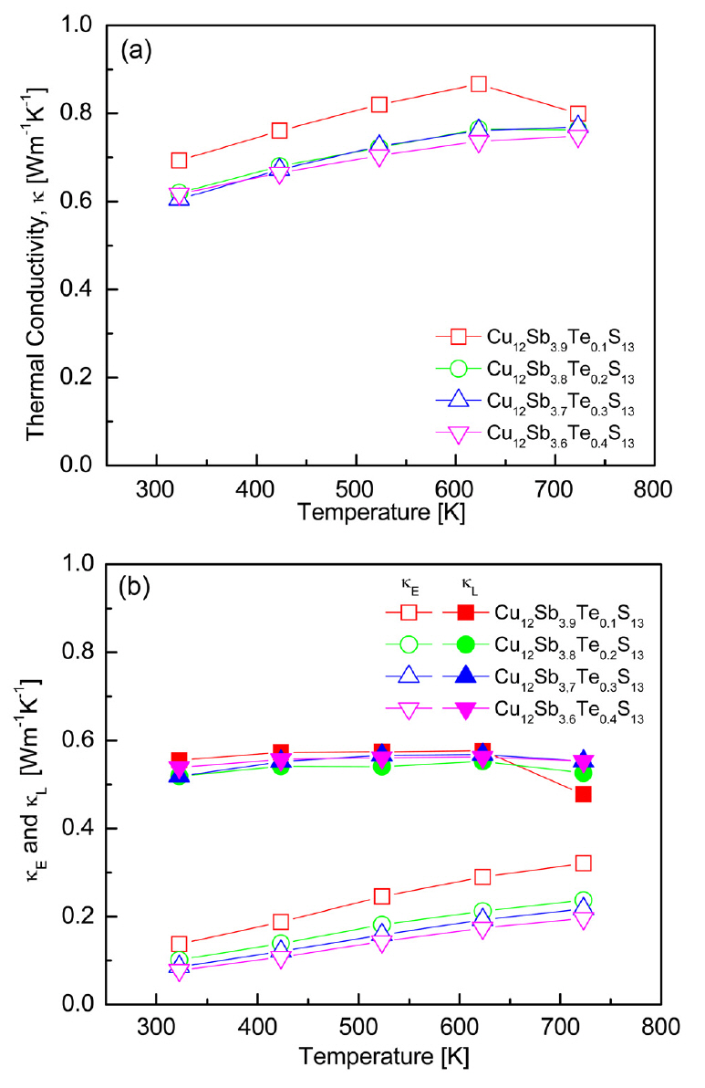 Figure 7 shows the thermal conductivity of the Cu12Sb4-yTeyS13 compounds. The thermal conductivity exhibited values below 1.0 Wm-1K-1 at 323−723 K for all samples, as shown in Fig 7(a). As the Te content increased, the value decreased from 0.69 to 0.61 Wm-1K-1 at 323 K and 0.80 to 0.75 Wm-1K-1 at 723 K. The thermal conductivity of the undoped Cu12Sb4S13 ranged from 0.72 to 0.77 Wm-1K-1 at 323-723 K [15], and the Te-doped specimens also maintained low thermal conductivity values in this