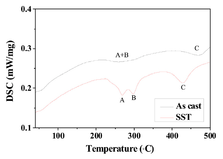주조 시편의 열 흐름 곡선에서 A와 B 반응이 연속되어 나타났는데, 이는 주조 상태는 용체화 처리를 하지 않아 G.P. Zone 형성의 구동력(driving