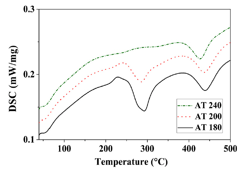 시편의 경우 A와 B에 해당하는 2개의 곡선이 중첩되어 하나로 나타났고, AT240 시편에서는 A+B 곡선이 관찰되지 않았다. 앞서 언급 한 바와