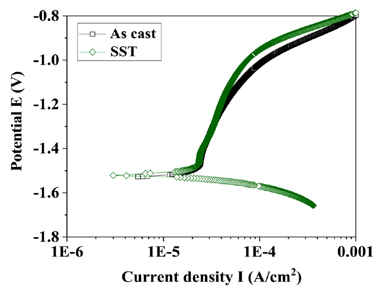 밀도는 4.57 × 10-6 A/cm2으로, 용체화 처리 된 시편의 최대 부식 전류 밀도 6.33 × 10-6 A/cm2 보다 낮다. 부식 전위와 최대 부식 전류 밀도를 비교하여 주조 시편에 비해 용체화 처리 된 시편의 내부식성이 더 높다는 사실을 알 수 있다. Al-Mg-Si
