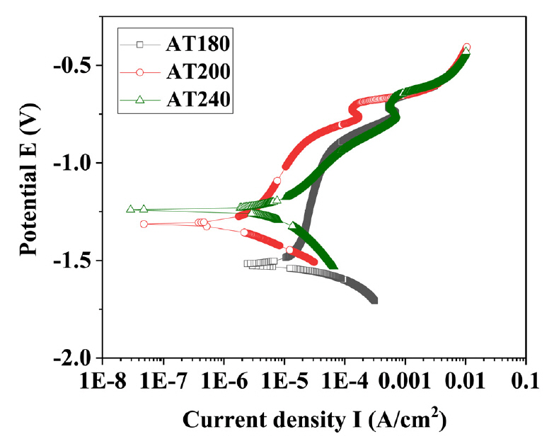 효과는 β” 상과 β’상 석출이 완료된 AT240 시편에서 가장 높게 나타났다. 주조 시편에서 Mg2Si상이 결정립계에 존재하면 양극으로 작용하기 때문에 모재의 부식을 촉진한다는 기존 연구들과 달리 [7,25], 본 연구에서는 입내에 석출하는 미세한 Mg2Si상이 합금의 내부식성을 향상시키는데 기여한 것으로 보인다.