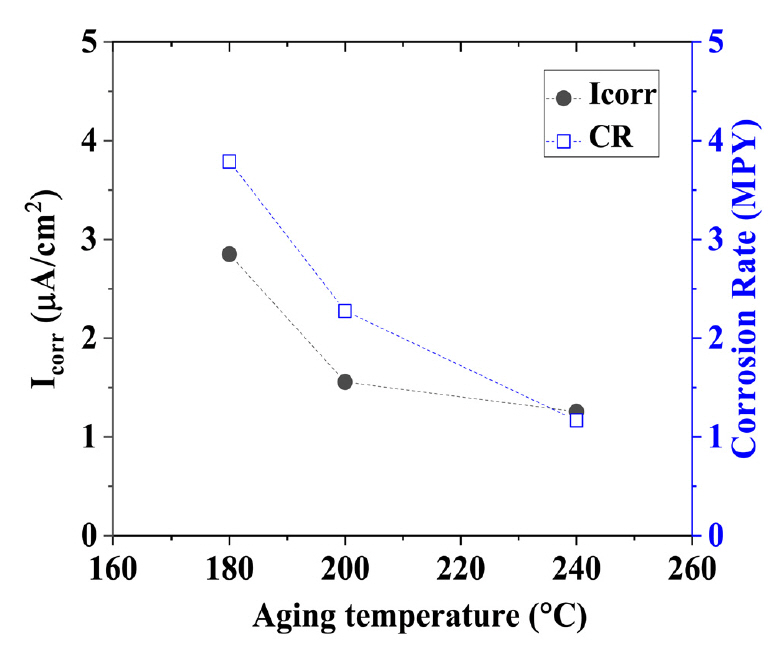 최대부식전류밀도 역시 시효 온도가 증가할수록 감소하여 합금의 내부식성이 증가하는 것을 알 수 있다. 부식속도는 AT180 시편이 3.79 MRY로