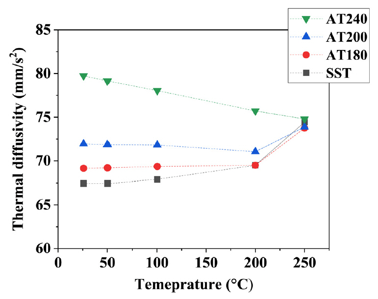 감소한다. 한편, 열 흐름 곡선 결과에서 석출반응이 완료되지 않았던 SST, AT180 시편은 상온 열확 산도는 낮으나, 온도가 증가하는 경우에도
