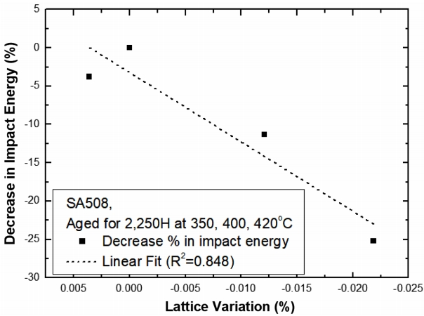 그림 10은 350-420 °C에서 2,250H 열적 처리한 시편의 격자 수축을 XRD로 측정하여 16 °C 충격 에너지 감소율에 대해 도시한 것이다. 격자