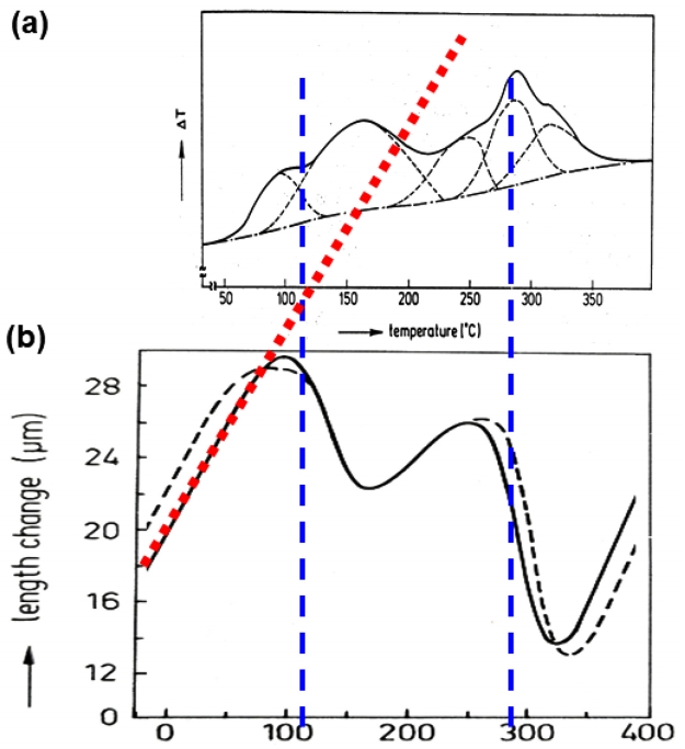 (a) DTA curve showing overlay of multiple exothermic reaction and (b) dilatometer
