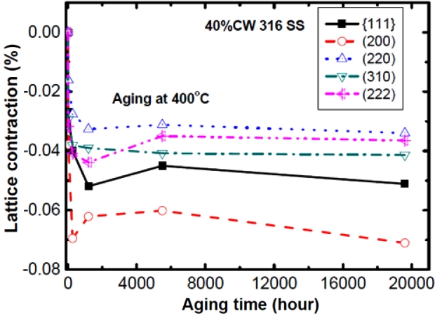 격자 상수(Ao)를 구하고, 그 변화를 분석하였다. 격자 변화율은(Ao aged-Ao as received)/Ao as received로 계산하였다.