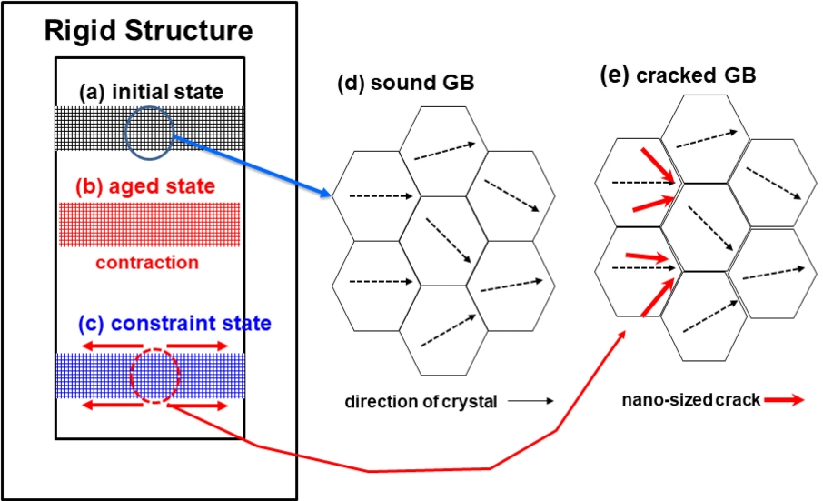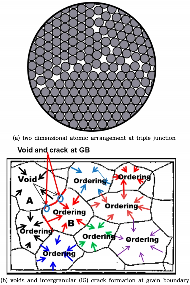이로 인하여 입계 취화가 발생한다는 새로운 기구가 보고되었다 [1,2,11-13]. 이 기구는 원자 정렬에 따른 엔트로피 감소에 의해 구동되며, 재료 스스로 수축을 일으켜 입계에 인장 응력을 형성함으로써 입계를 벌리고, 궁극적으로