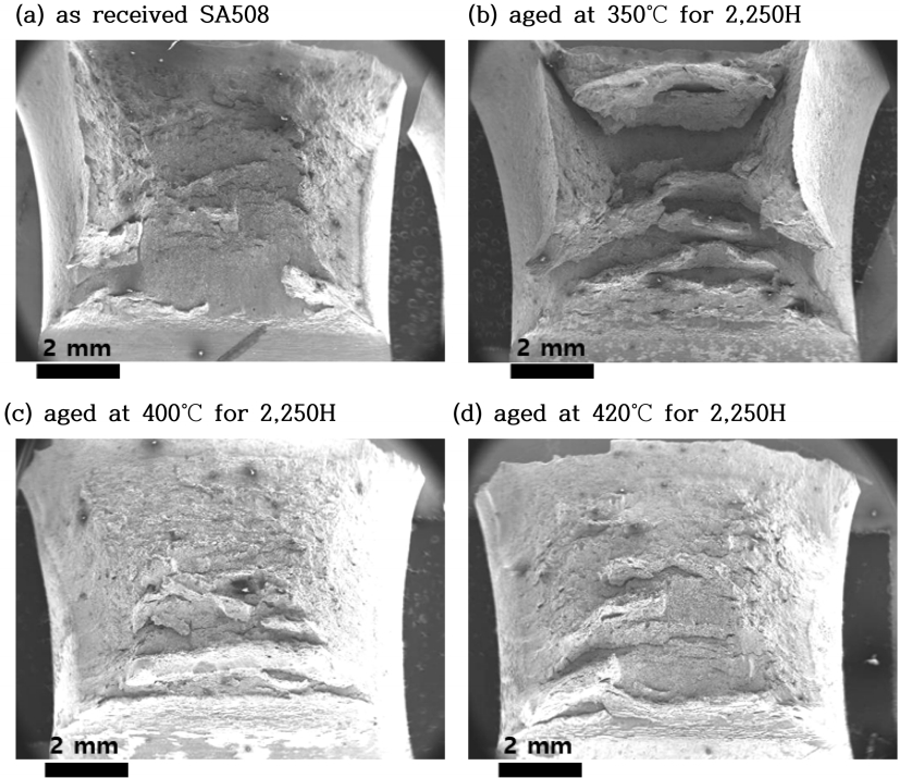 그림 4는 350-420 °C에서 2,250H 열적 처리한 시편을 16 °C에서 충격 시험한 시편의 파면을 SEM으로 관찰한 결과이다. 사진의 아래쪽에 노치가