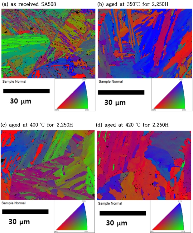 그림 5는 350-420 °C에서 2,250H 열적 처리한 시편을 EBSD로 분석한 결과이다. As received SA508은 bainite 조직을 가진다.