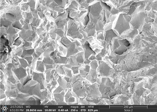그림 2에는 러시아 압력 용기 재료에서 확인된 입내 파괴와 입계 파괴 파면을 나타내었다 [7]. 그림 2의 (a)는 입내 파괴를, (b)는 입계 파괴를 각각 나타내고 있다. 최근, 이 입계 파괴 시편에 대한 분석은 결정 입계에 인(P)의 편석 [8], 탄화물의 석출 [9,10], MnNi rich 상 석출[5] 등을 확인하였으며, 이것 때문에 입계 파괴가 일어나는 것이라고 보고하고 있다. 이들 연구는 미세조직 차이를 분석한 것이지만, 이런 기존의 패러다임은