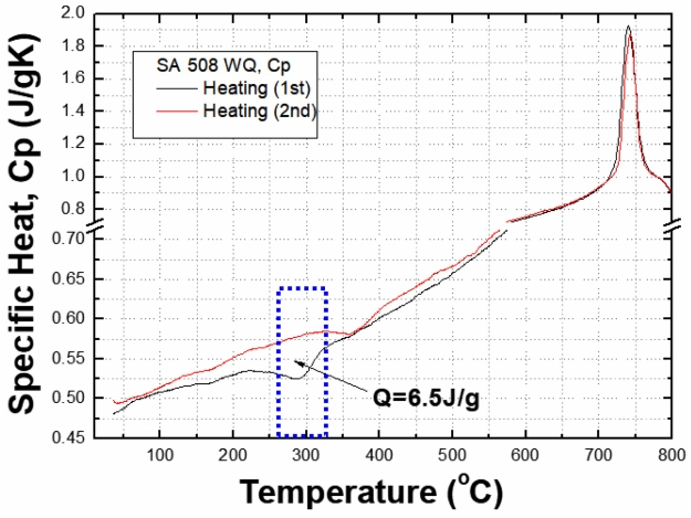 동일 시편을 2회 DSC 분석하여 SA508에서 WQ 시편에서 나타나는 엔트로피 감소량을 정량화하였다.