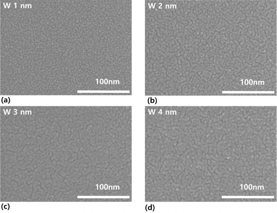 그림 2는 전자주사현미경을 이용하여 촬영한 W층의 두께 변화 (1-4 nm)에 따른 박막의 평면 (plan-view) 형상이다. 진공 증착 과정에서 낮은