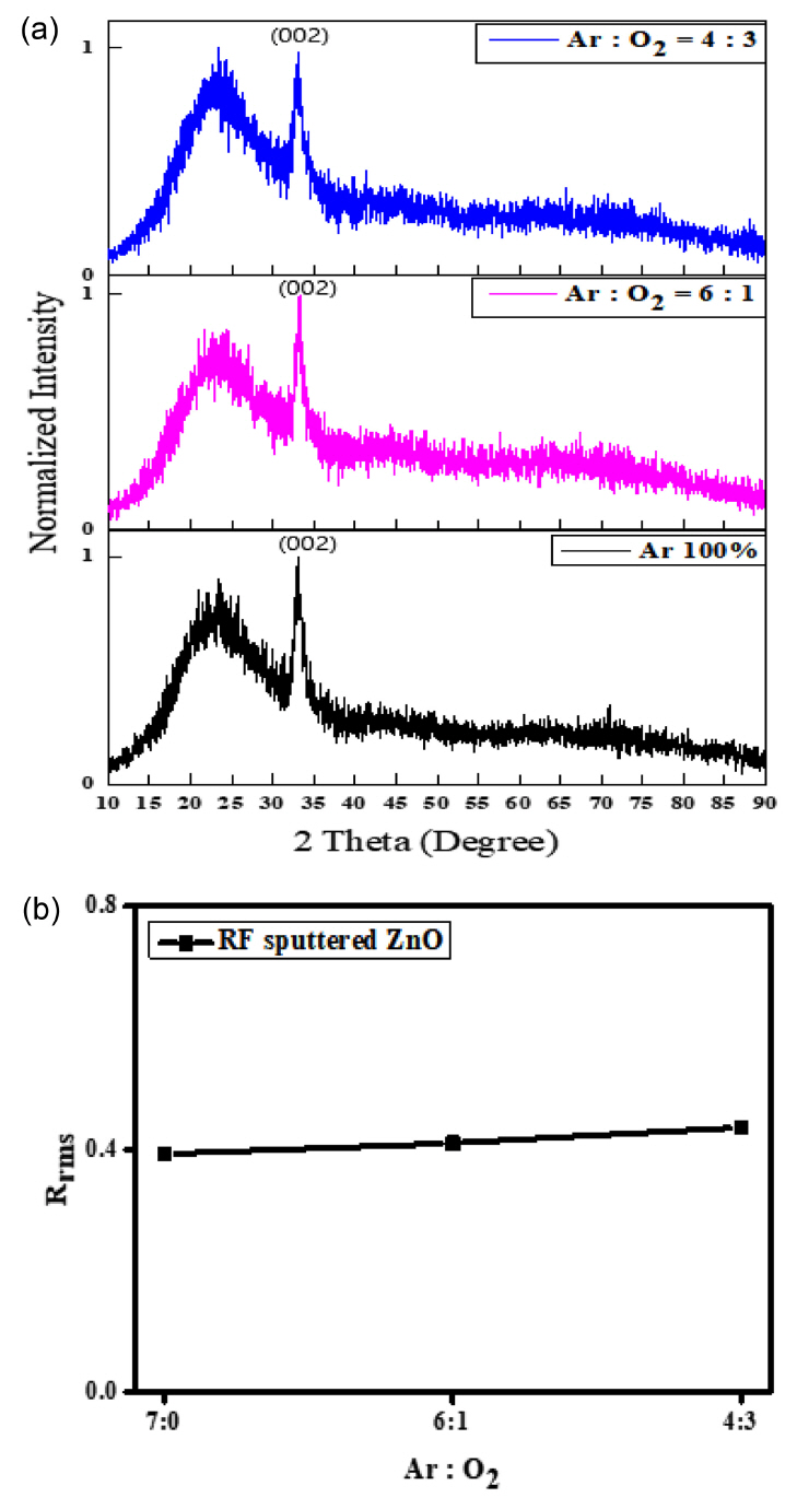 (a) XRD patterns and (b) roughness of various sputtered ZnO thin films.