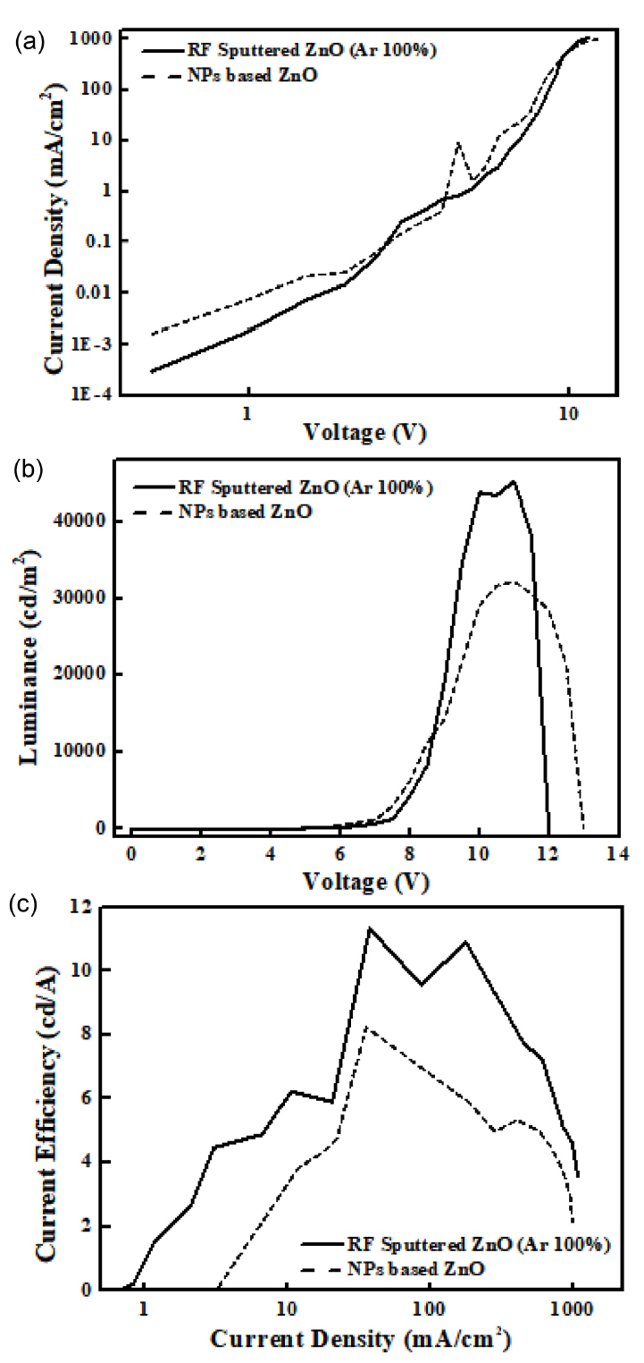 그림 3(a)에서 RF sputtered ZnO 박막을 사용한 QLEDs에서 전류 밀도는 감소하는 경향을 보이며, 그림 3(b)에서 최대 휘도가 45,306 cd/m2로 ZnO NPs의 32,233 cd/m2보다 증가하였다. 그림 3(c)에서는 RF sputtering 방법으로 증착된 ZnO 박막을 사용한 QLEDs의 전류 효율이 11.32 cd/A로 ZnO NPs의 8.23 cd/A보다