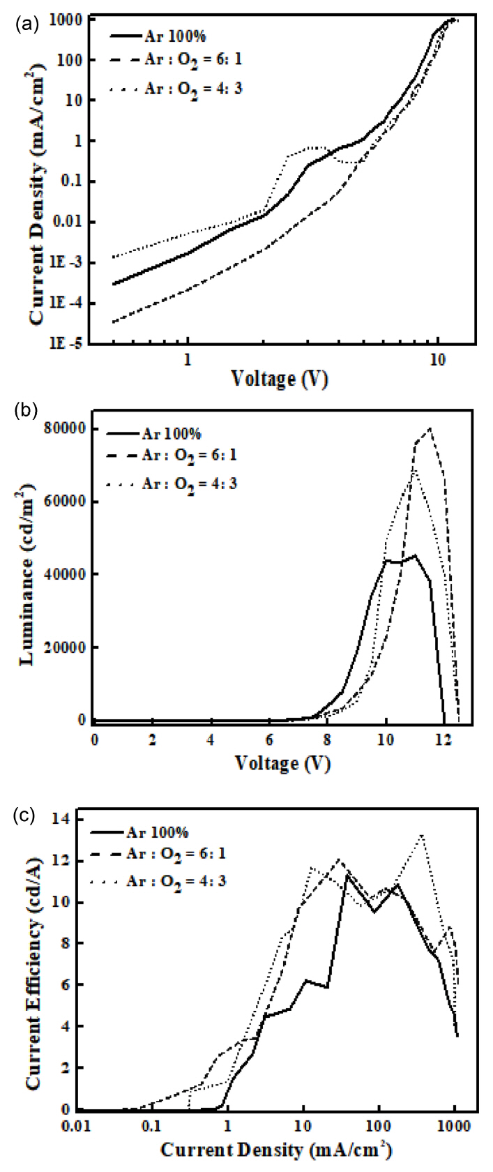 제한되어 전자와 정공의 EML에서의 재결합이 향상된 효과로 보인다. 또한 EOD를 통해 주입되는 아르곤과 산소의 비율에 따른 ZnO 박막의 전기적