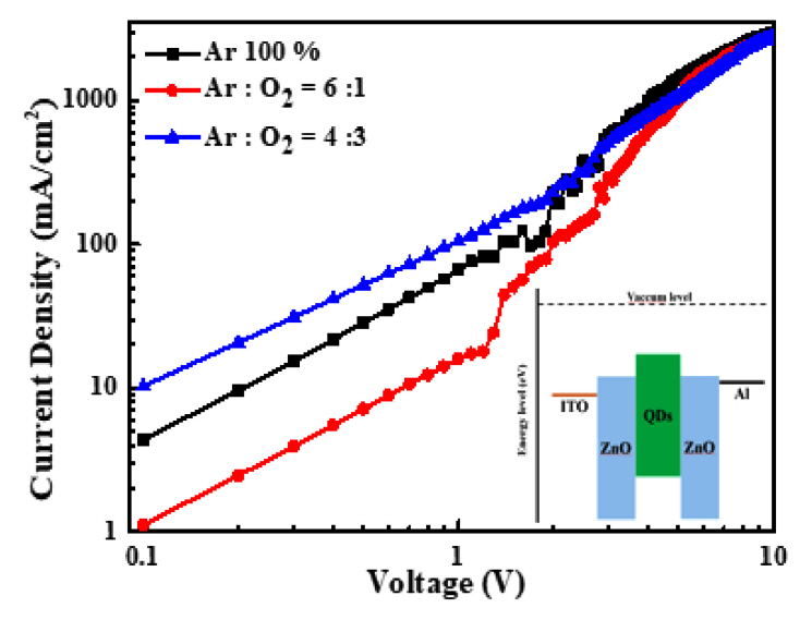영역에서는 산소 분압의 차이가 전류 밀도에 크게 영향을 미치지 않았다. 아르곤과 산소의 비율이 6:1인 ZnO 박막을 사용한 QLEDs의 최대 휘도와