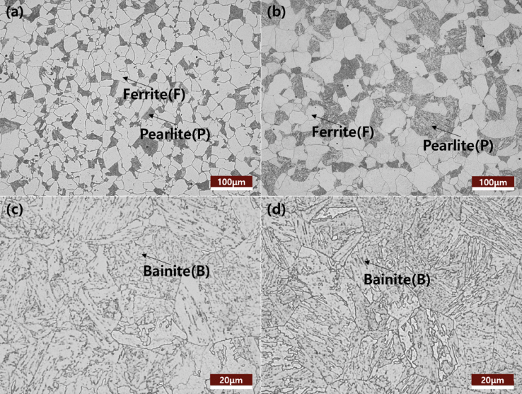 4종 소재의 미세조직을 광학현미경으로 관찰하여 그림 1에 나타내었다. 그림 1(a), (b)의 공냉을 수행한 P11AC와 P22AC에서는 모두 ferrite−pearlite 조직이 관찰되었다. Peralite/ferrite 상분율 분석결과,