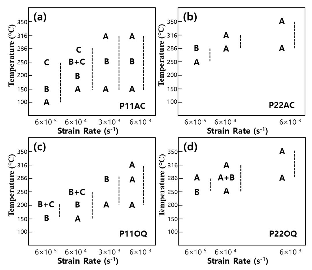 P11AC와 P11OQ의 미세조직별 serration 거동을 확인하기 위해 변형률 속도와 온도 별 serration type을 그림 11에 나타내었다. Rodriguez [11]는 응력-변형률 곡선의 형상으로 serration type을 정의하였으며, 선행 연구들에서 A, B, C type을 주로 분석에 활용하였다 [26-30]. Type A serration은 저온에서 침입형원소에 의한 전위의 고착 및 풀림으로 진폭이 부드럽게 나타나고 type B serration은