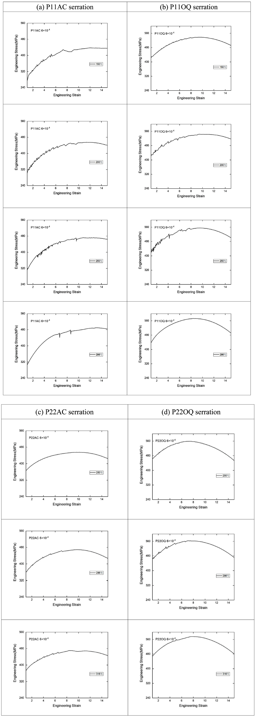 조직의 P11OQ에서는 150~250 °C, P22OQ에서는 250~316 °C에서 serration이 관찰되어 bainite 조직에서도 P11OQ의