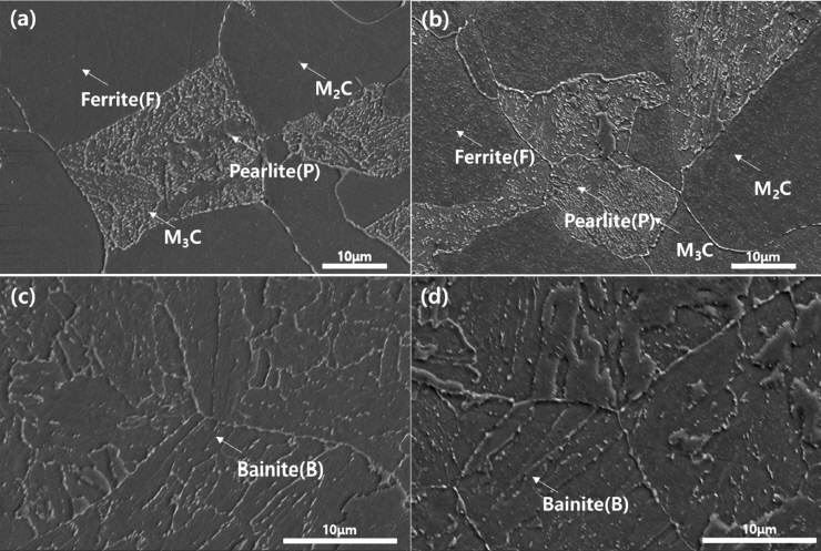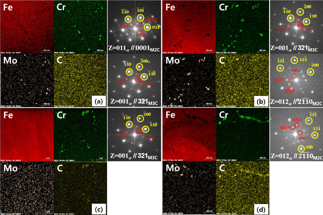 있다. 반면 bainite 조직의 그림 3(c), (d)의 P11OQ에서는 Cr이 주성분인 M3C가 관찰되었고 P22OQ에서는 Mo가 주성분인 M2C가 형성되어 있는 것으로 분석되었다.
