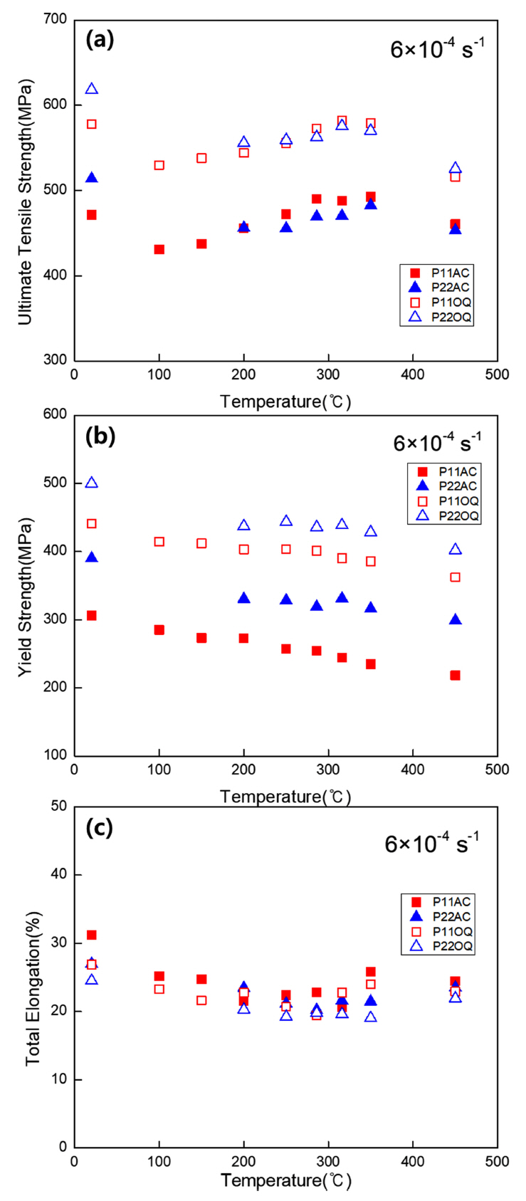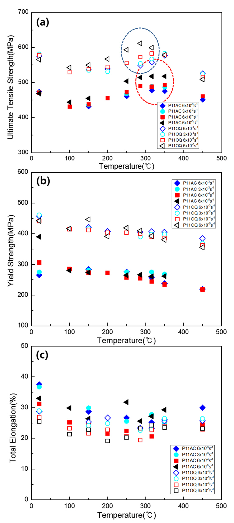 일정온도 범위에서 증가하였다. ferrite−pearlite 조직의 경우 150 °C부터 증가하다가 200~450 °C의 범위에서 P11AC의 최대인장강도가