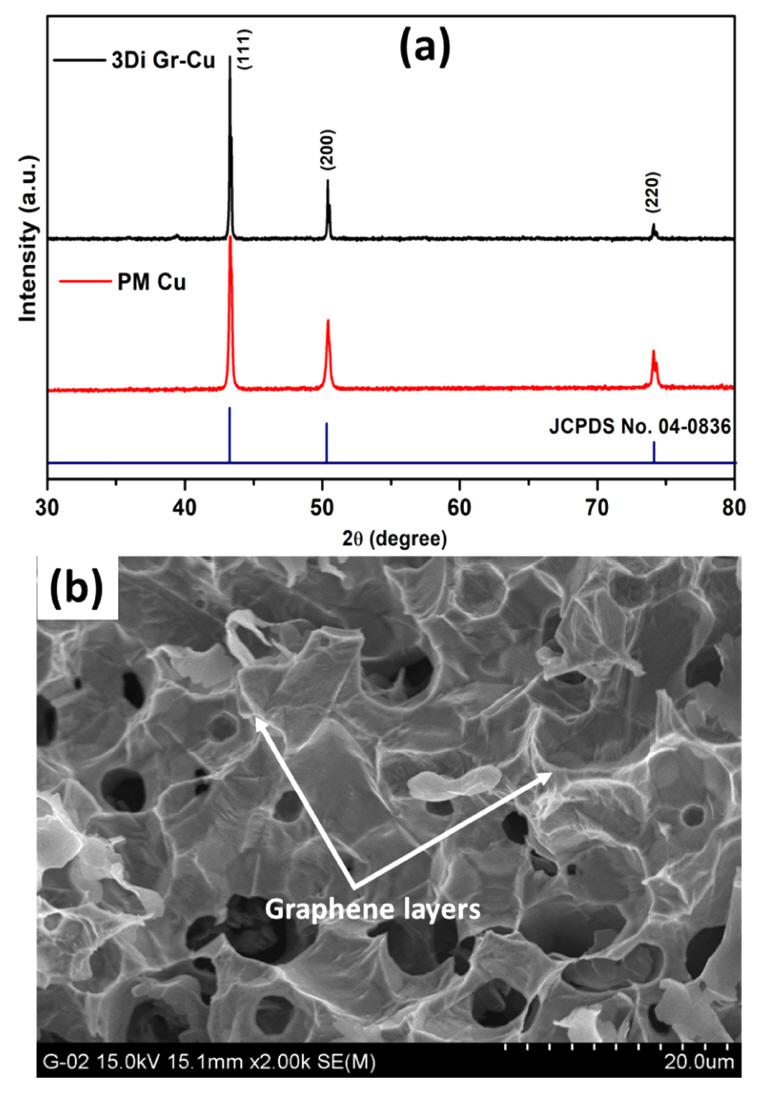 (a) XRD patterns of PM Cu and 3DiGr Cu composite (b) SEM image of the 3-dimensionally