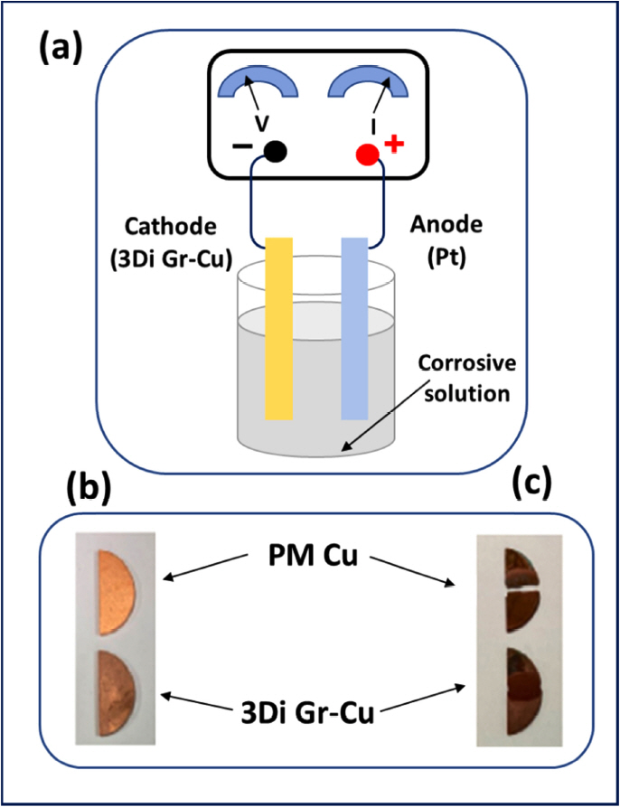 solution (pH = 0.7), 0.3 g·mL−1 ammonium persulfate ((NH4)2S2O8) was dissolved in DI water and a small amount of nitric acid (HNO3) added to adjust the pH. The disc samples of PM Cu and 3Di Gr-Cu were cut into halves