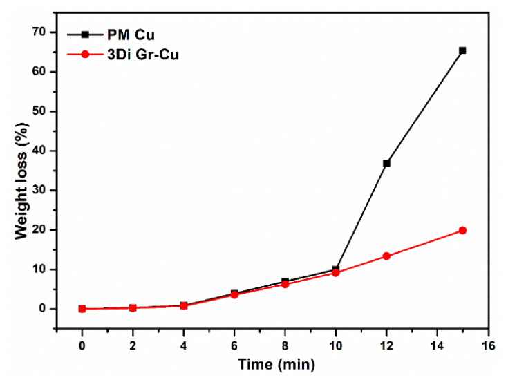 Weight loss of PM Cu and 3Di Gr-Cu composite vs. time during HAC experiment.