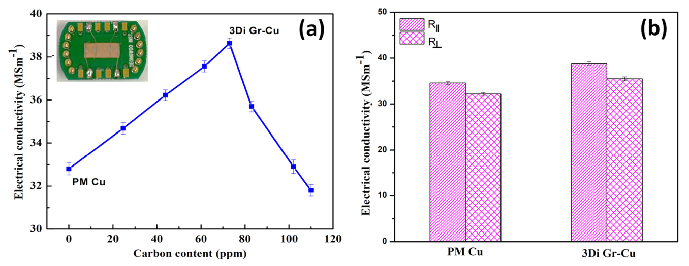 (b) electrical conductivities of the PM Cu and 3Di Gr–Cu composite along directions