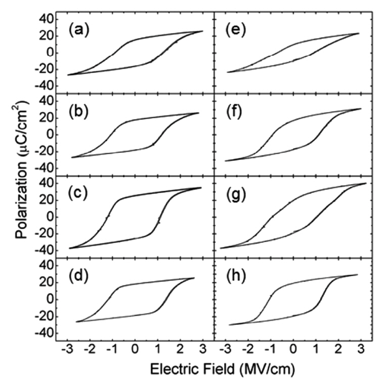 Polarization scans collected after electrical cycling from the (4 nm HfO2/4 nm ZrO2), (2 nm HfO2/2 nm ZrO2) ร 2, and (1 nm HfO2/1 nm ZrO2) ร 4 nanolaminates and the HfZrO4 solid solution deposited at 285 ยฐC (aโd) and 260 ยฐC (eโh). (Reproduced from S. L.