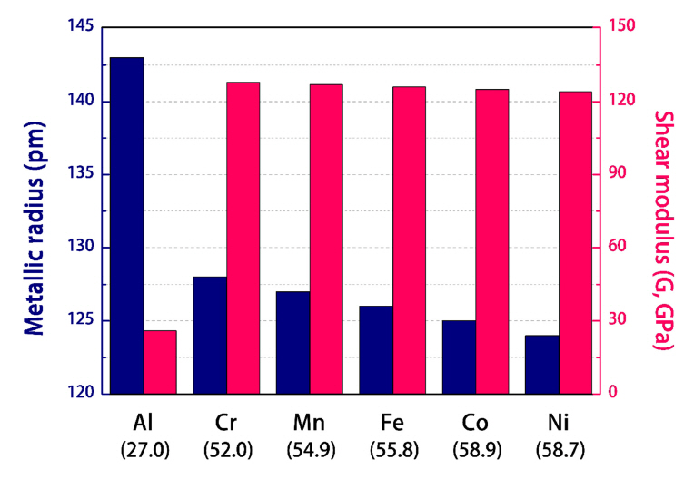 ๋ณด๊ณ ๋๊ณ ์๋ค [8]. Fig 1์ 3d TM ๋ค๊ณผ Al์ ๊ธ์์์ ๋ฐ๊ฒฝ(metallic radius, r)์ ์ ๋จ ๊ณ์(shear modulus, G)๋ฅผ ์์๋ฒํธ ์์์ ๋ฐ๋ผ ๋ํ๋ธ