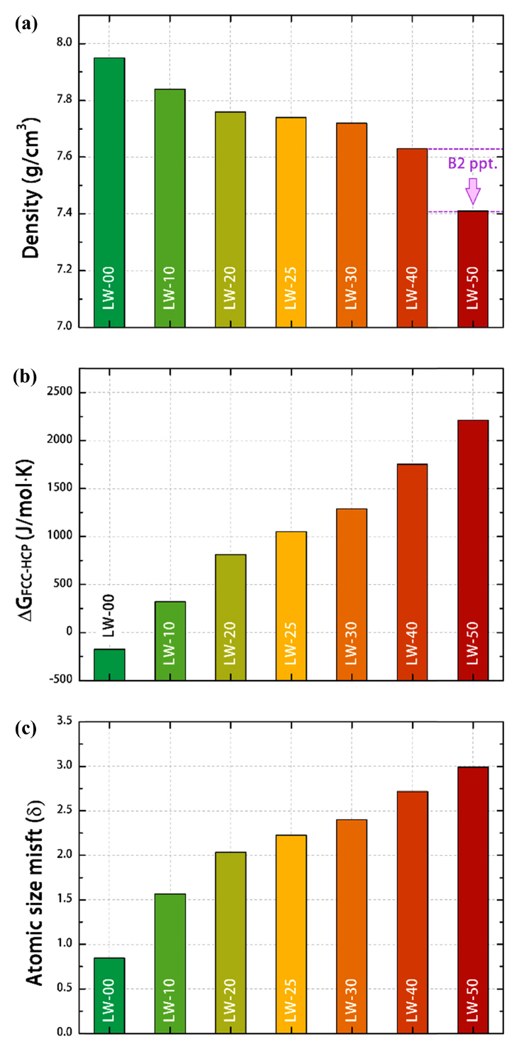 (a) Density, (b) ฮGFCC-HCP, and (c) Atomic size mismatch of LW-XX HEAs.