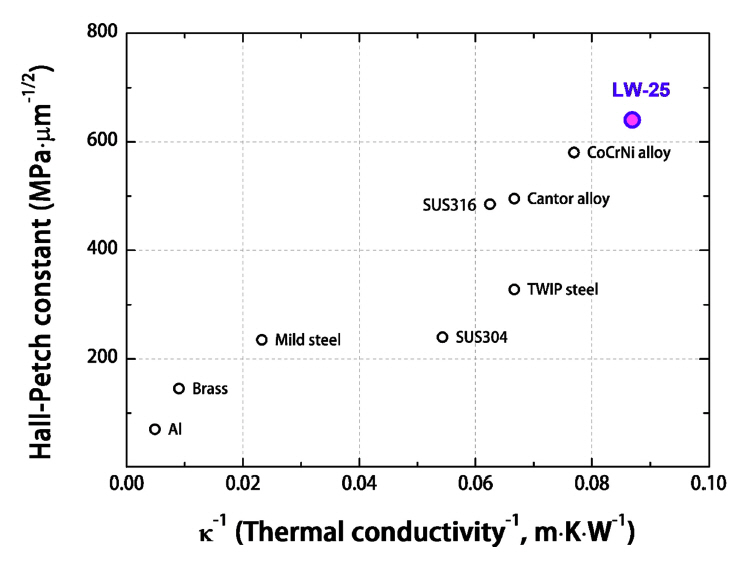 Hall-Petch constant (ky) of FCC alloys plotted against the 1/ฮบ, which represents the degree of lattice distortion.