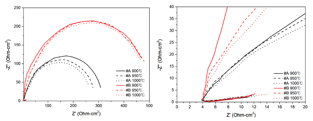 Rs and Rp data of EIS analysis results by heat treatment conditions for #A and #B