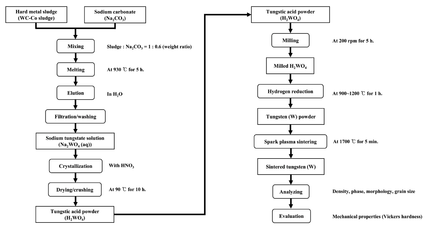 그림 1은 본 연구에서 제시하는 초경합금 슬러지 재활용 및 텅스텐 제조 공정을 나타낸 것이다. 초경합금 슬러지는 초경합금 가공 중에 발생되며 가공 중 혼입된