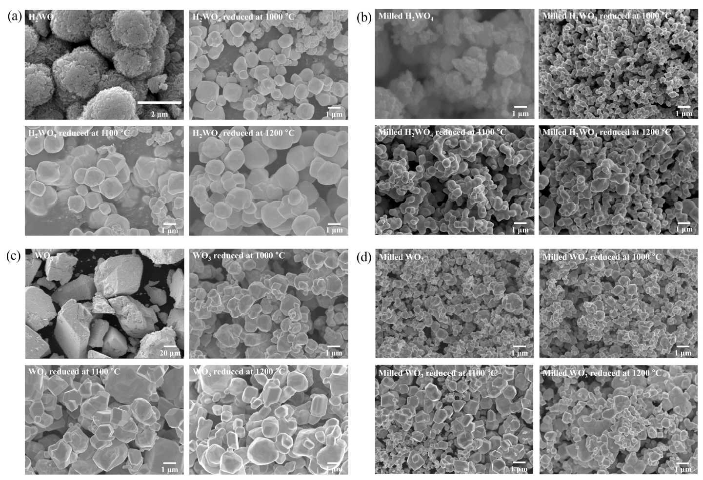 SEM micrographs for the tungsten powders prepared by hydrogen reduction of (a) H2WO4 (b) milled H2WO4 (c) WO3, and (d) milled WO3 at 1000~1200 °C.