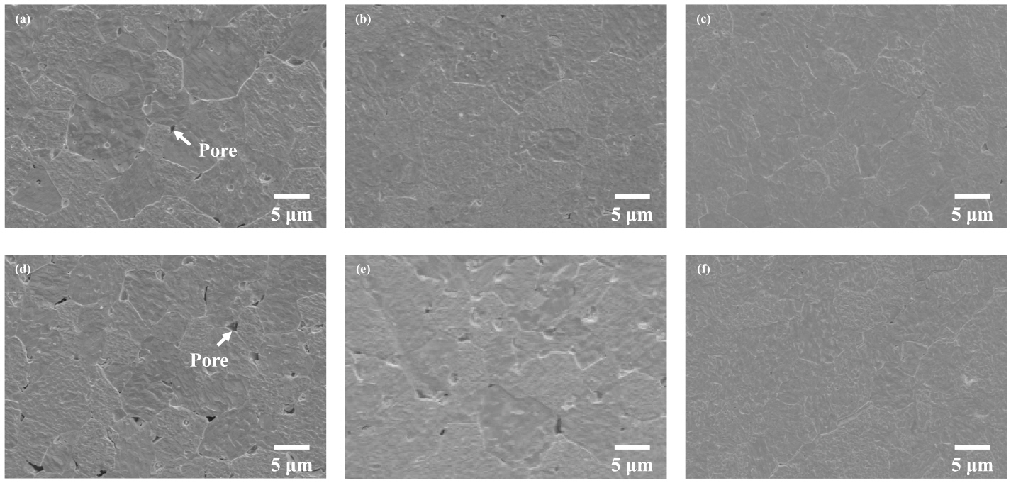 소결된 텅스텐은 미세조직 관찰과 기계적 특성 평가를 위해 6, 3, 1 μm 입도의 다이아몬드 슬러리를 사용하여 표면 연마하였다. 표면 연마된 텅스텐
