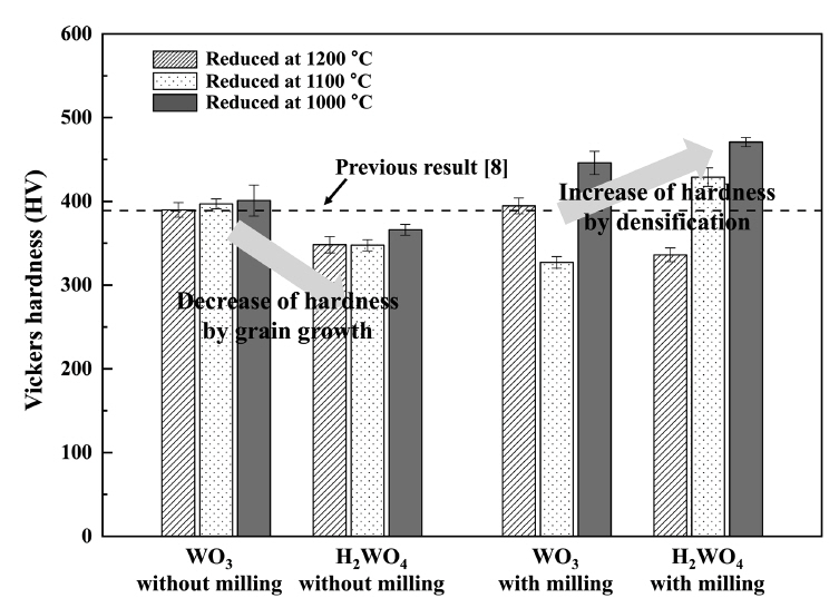 따라 달라지게 되는데 밀도가 높을수록 텅스텐 소재 특성(경도)이 우수하다. 따라서 기공이 제거된 완전 치밀화된 텅스텐 소결체를 제조하는 것이 텅스텐