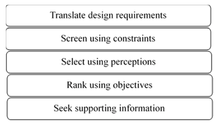 제품에 적합한 재료를 선택하는 과정을 구체적으로 살펴보면, Ashby의 엔지니어링 기반 재료선택 방법은 네 단계로 구성되는데, (1) 디자인 요구사양