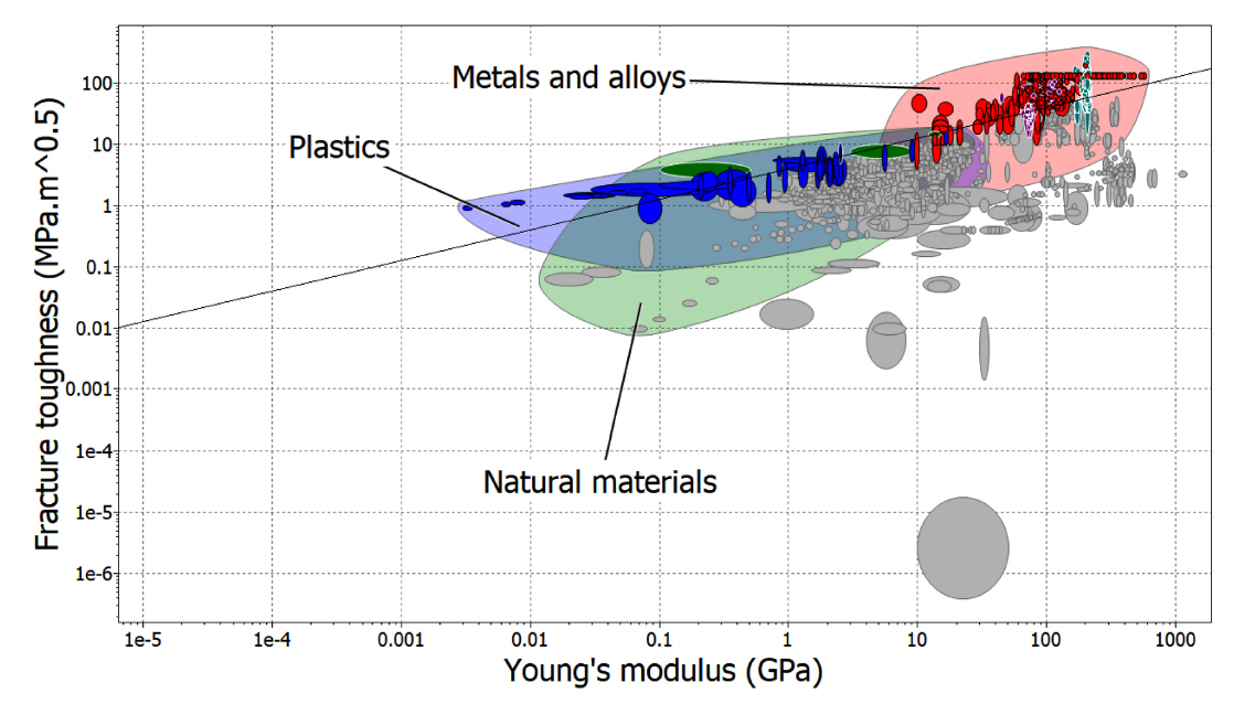 수 있다. 각 사선은 일정한 충격강도를 가지며, 그림 2의 사선 위에 있는 모든 재료들은 13.6의 충격강도를 갖는다. 이 사선을 경계로 위쪽에 위치한 재료들은 13.6 이상의 충격강도를 가지며, 제품디자인에서