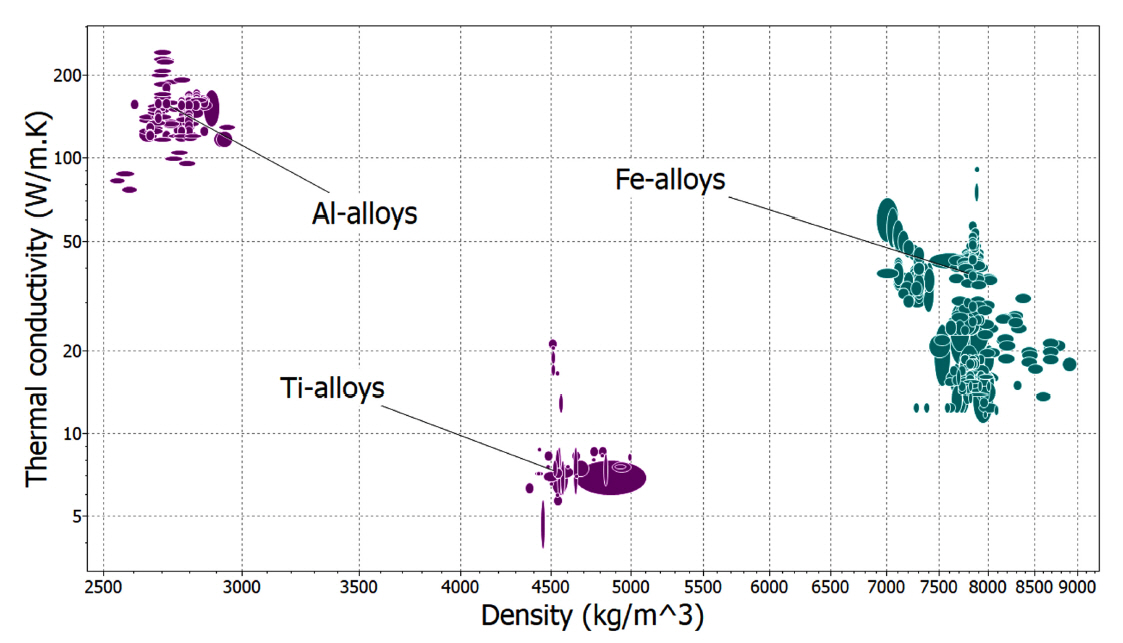 1차적인 후보들을 대상으로 재료선택의 다른 목표인 열전도도를 이용하여 재료선택차트를 구하면 그림 4와 같다. 열전도도가 높고, 밀도가 낮은 재료는 차트의 왼쪽 윗부분에 위치한다. 그림 3에서의 1차후보였던 철과 타이타늄 합금은 아래로 많이 치우쳤고, 알루미늄 합금은 왼쪽 윗부분에 위치한다. 따라서 재료선택의 모든 목표에 적합한 재료는