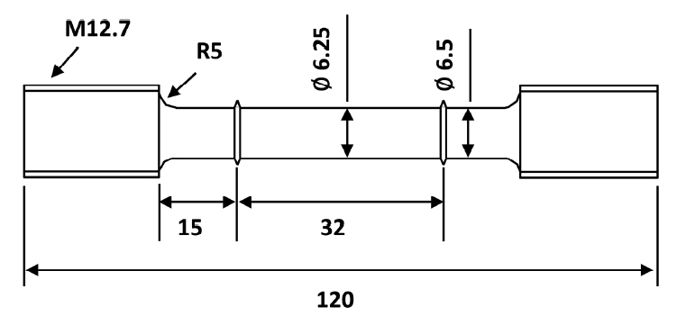열처리 및 예비변형이 적용된 직사각형 형태의 시편을 그림 2와 같이 그립부에 나사선을 가진 환봉 형태의 시편으로 가공하였다. 크리프 파단 시험은 기본적으로 ASTM E139에 따라 진행되었는데, 분위기는 대기