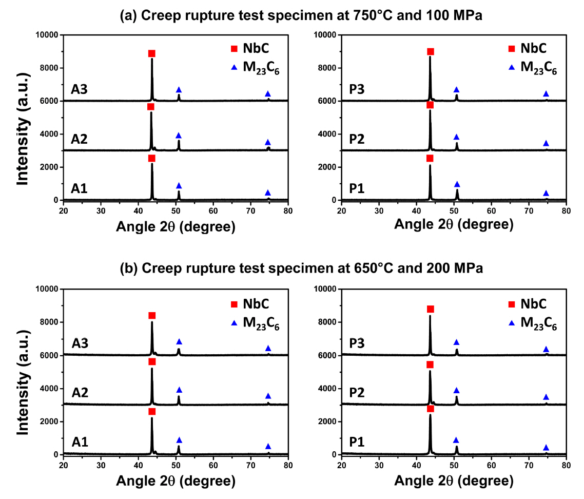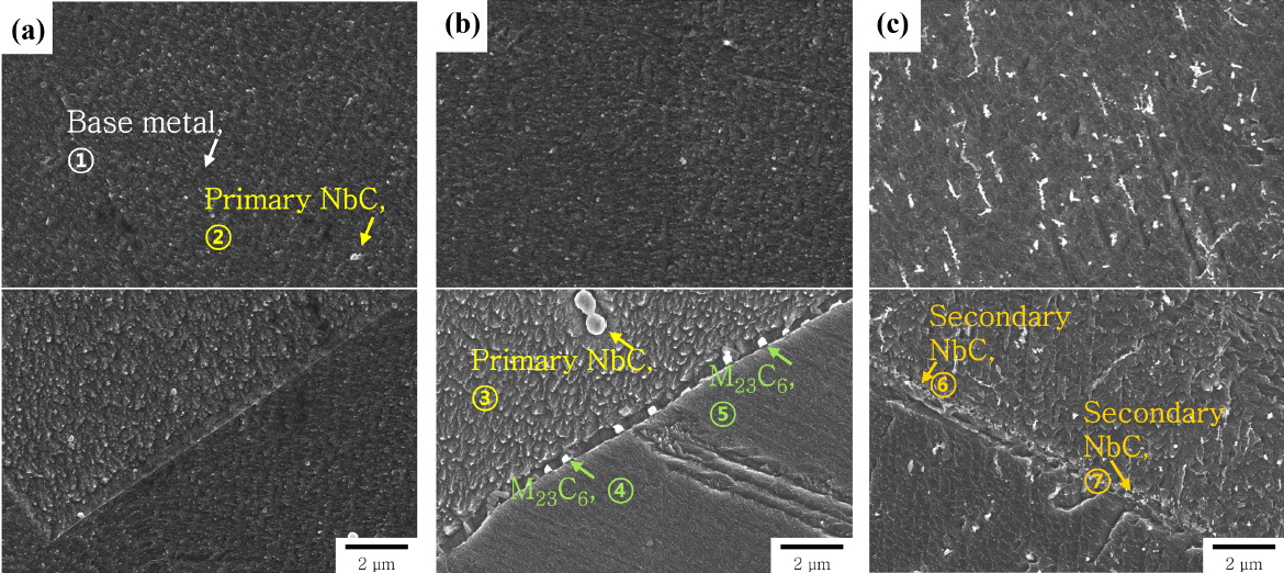 기존 보고된 문헌에 따르면 NbC 석출물이 재열균열 발생에 중요한 역할을 하는 것으로 알려져 있지만[37] NbC 형성량이나 다른 석출물의 영향에 대한 연구는 미비한 실정이다. 실제로 STS 347 스테인리스강에서 형성될 수 있는 석출물은 M23C6, MX, 시그마상(σ phase), Z phase, 라베스상(Laves phase) 등으로 다양하다 [32,33]. 하지만 재열균열이 비교적 짧은 시간에 발생한다는 점을 감안하면 재열균열 발생 시점에 존재할 수 있는 주요 석출물은 NbC, M23C6이다 [34]. 반면 STS 304나 316 스테인리스강은 M23C6가 주요 석출물이고 MX 석출물은 형성되지 않지만, 이 강재들도 재열균열이 발생된다는 것을 감안할 때 M23C6 석출물 형성에 따른 재열균열 영향은 더욱 관심있게 확인해 볼 필요가 있다.