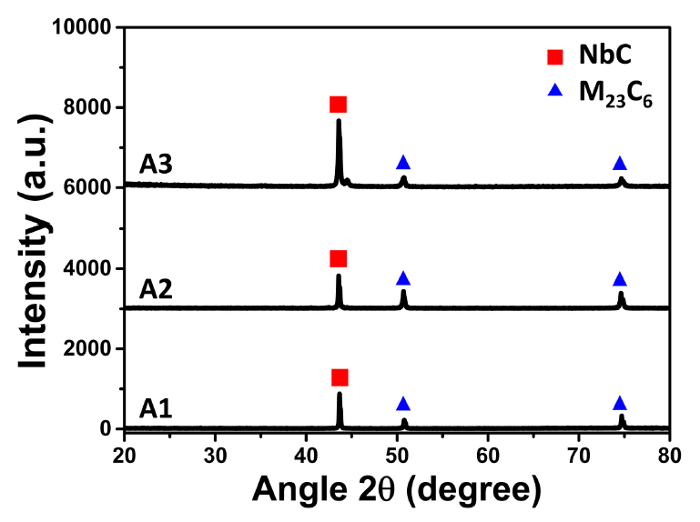 미고용 되었거나 냉각 과정 간에 소량 형성된 NbC와 M23C6가 존재하는 것을 알 수 있다. 반면 A2 시편은 A1 대비 NbC 함량의 변화는 거의 없지만 M23C6 양은 많아졌고, A3 시편에서는 A1 대비 M23C6의 함량 변화는 거의 없지만 NbC의 양이 증가한 것을 알 수 있다.