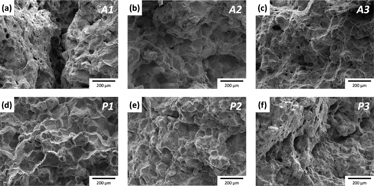 파단 시험 전에 형성시킨 석출물의 종류에 따라 크게 차이가 났는데, A3 대비 P3는 55% 정도만 감소되었지만 A1과 A2 대비 P1과 P2는 90%