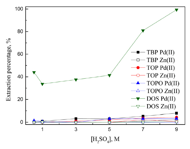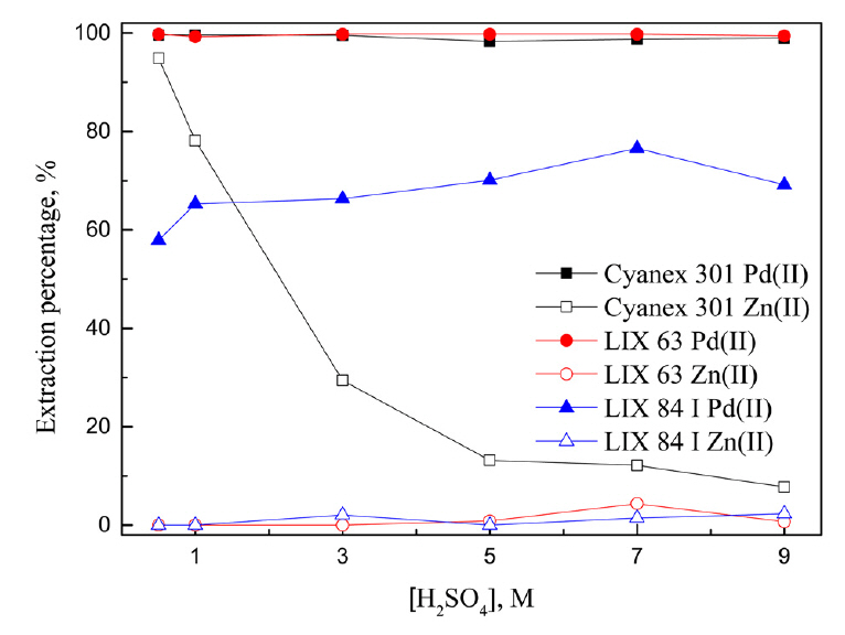 황산용액에서 용매추출에 의한 팔라듐과 아연의 추출 거동을 조사하기 위해 황산팔라듐(PdSO4, Aldrich, 98%)과 황산아연수화물(ZnSO4·7H2O, Duksan Pure Chemical Co., LTD., 99%)을 증류수에 용해시켜 두 금속이 혼합된 용액을 준비했다. 금속의 농도는 팔라듐